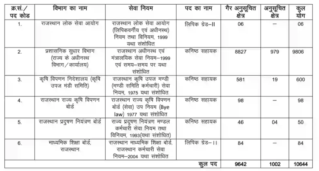 - कुल पद: Rajasthan LDC Recruitment 2026 में कुल 10,644 पदों पर भर्ती हो रही है, जिसमें से 9,642 पद सामान्य क्षेत्र (Non-TSP) के लिए हैं।